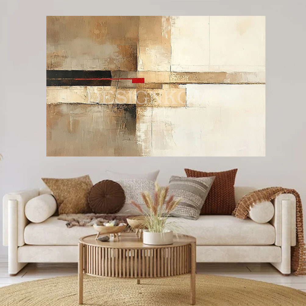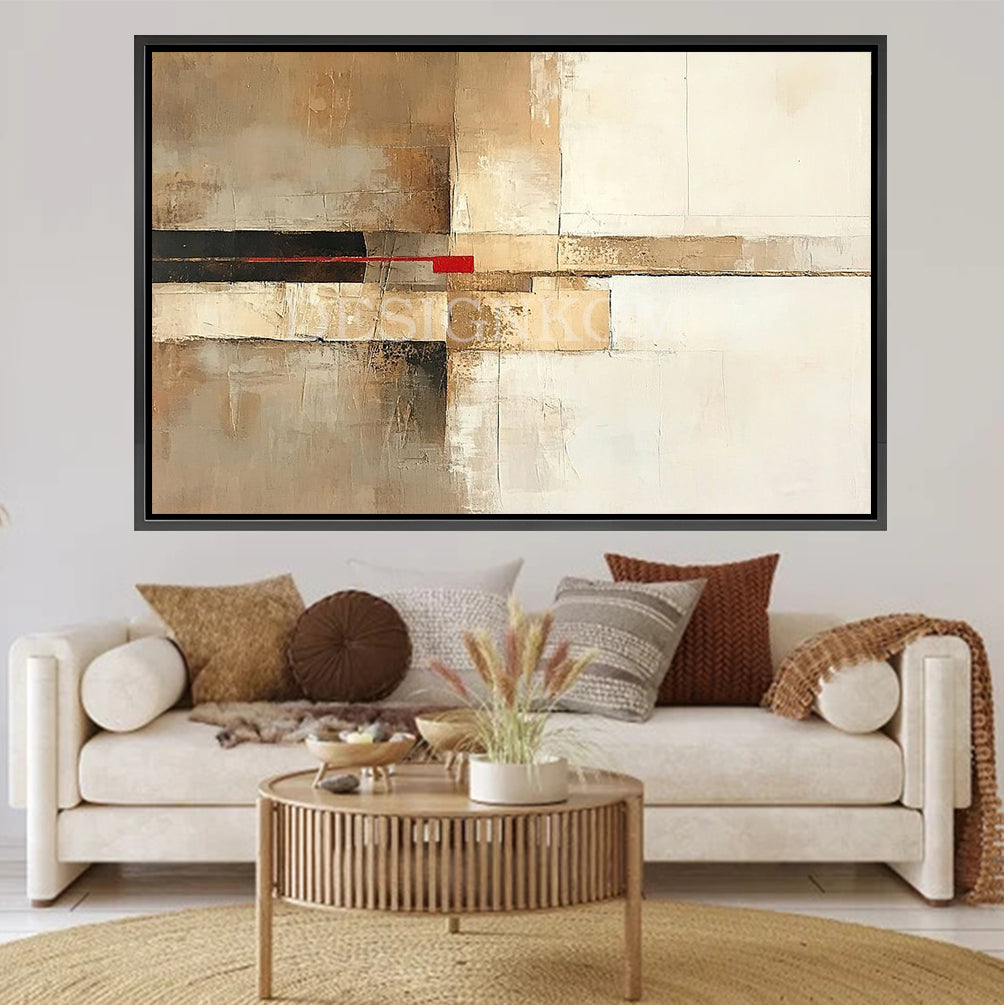 Ses nuances de beige, crème et brun, rehaussées de touches noires et rouges, créent une composition harmonieuse et contemporaine.