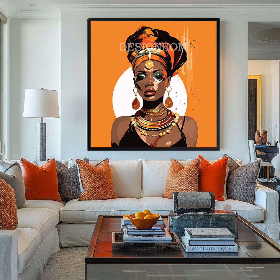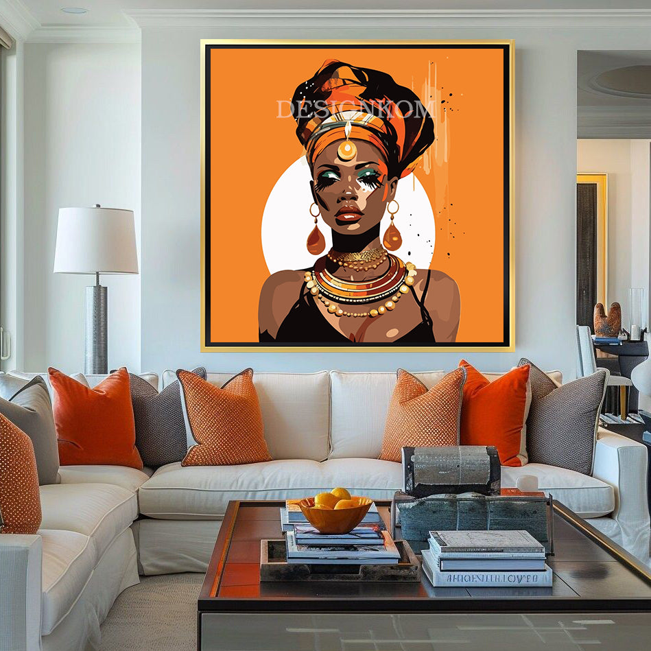 Ce tableau représente une femme noire stylisée, illustrée dans un style moderne et graphique. Elle porte un foulard traditionnel coloré, de grands bijoux dorés et un collier imposant. Son regard est intense et expressif, souligné par un maquillage artistique. L’arrière-plan orange vif en contraste avec un cercle blanc crée une composition forte et équilibrée, mettant en valeur sa silhouette et renforçant l’aspect culturel et majestueux de l’œuvre. L’ensemble dégage puissance, élégance et identité.