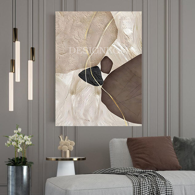 Ce tableau abstrait moderne met en scène des formes organiques dans des tons doux de beige, crème, taupe et marron foncé. Les textures riches, proches de l’effet plâtre et du relief artistique, apportent profondeur et sophistication. Quelques lignes dorées élégantes traversent la composition, ajoutant une touche raffinée et contemporaine.