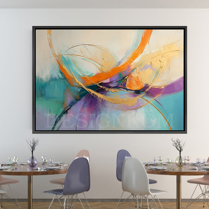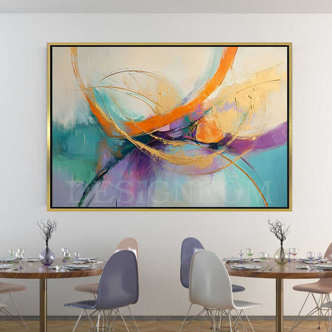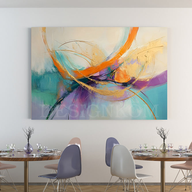 Les nuances de **turquoise, violet, orange et doré** s’entrelacent harmonieusement pour créer une composition pleine de mouvement et de profondeur.