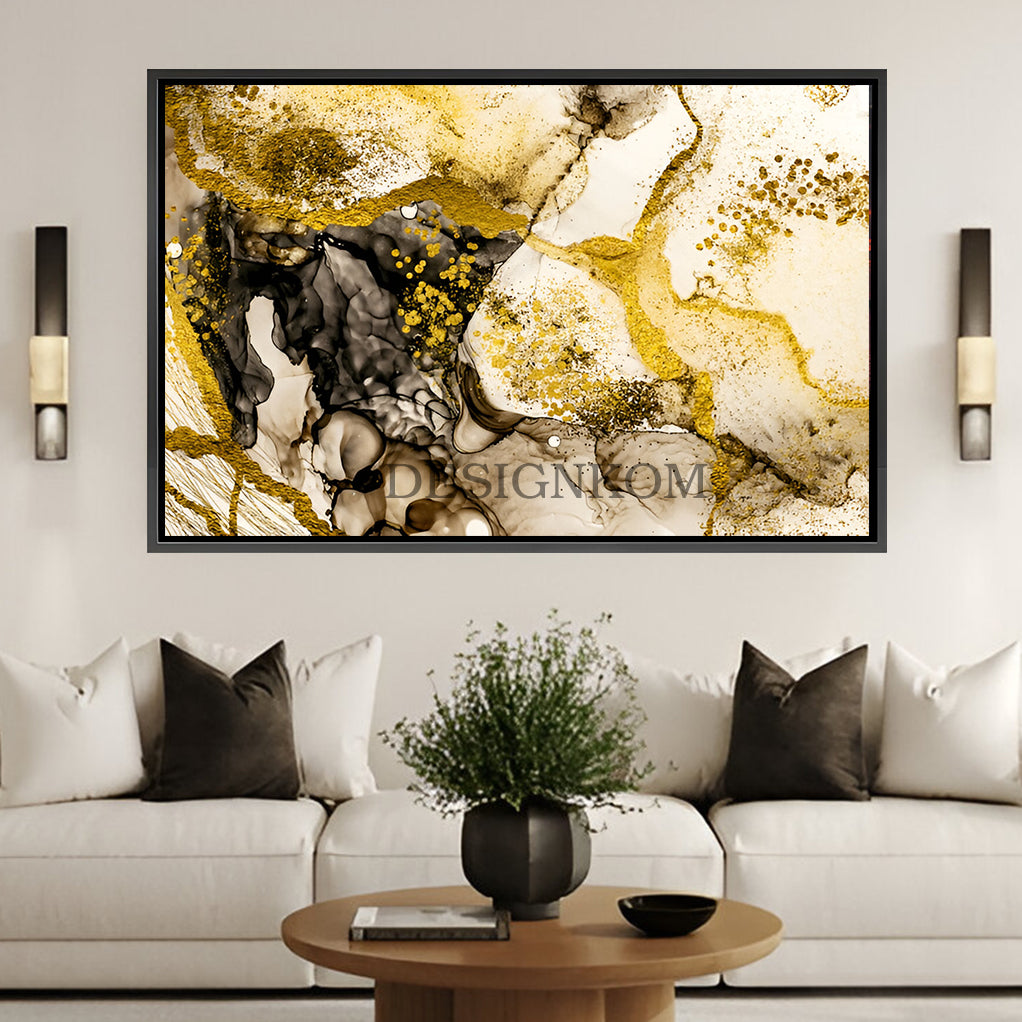 Ce tableau moderne abstrait met en scène un mélange harmonieux de teintes dorées, noires et beige, créant un effet luxueux et organique. Les coulures dorées et les textures fluides rappellent les mouvements de l’encre et du marbre, donnant une impression de dynamisme et d’élégance. Parfait pour un salon contemporain, il apporte une touche artistique sophistiquée et illumine l’espace grâce à ses reflets dorés et ses contrastes profonds.