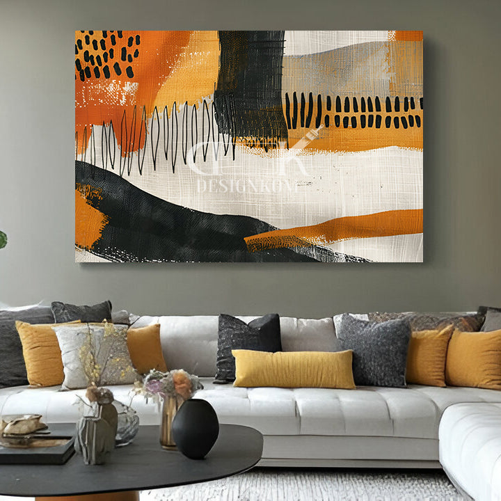 Ce tableau abstrait contemporain se distingue par une composition dynamique mêlant des tons chaleureux d’ocre et de moutarde à des contrastes profonds de noir et de blanc. Les lignes graphiques et les textures brutes apportent rythme et modernité à l’ensemble, créant une œuvre expressive et audacieuse. Idéal pour un salon moderne, un bureau design ou un espace de vie élégant, ce tableau devient un élément décoratif fort qui structure l’espace avec caractère et sophistication.