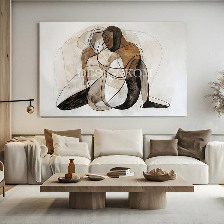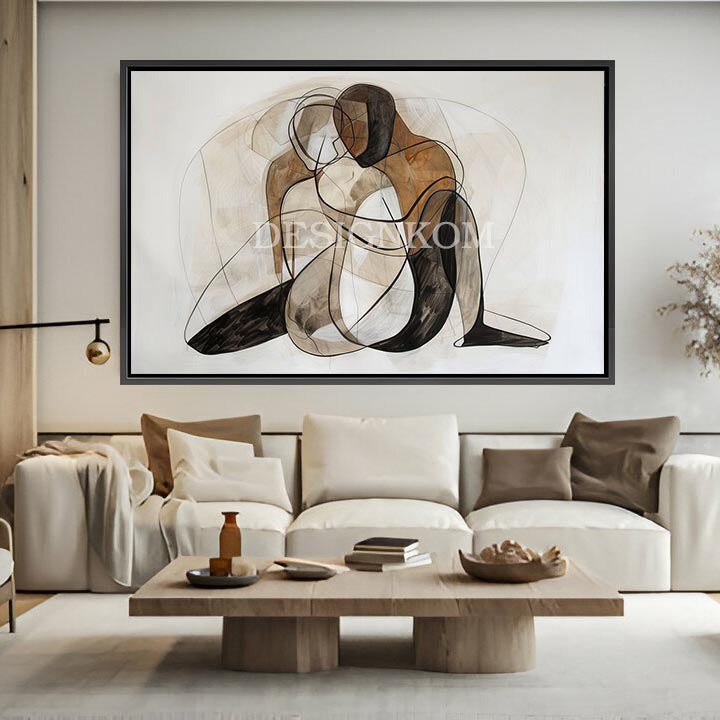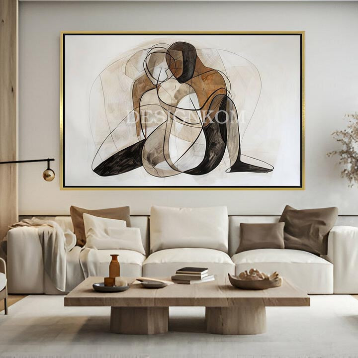 Ce tableau artistique représente deux silhouettes entrelacées, formant une harmonie parfaite entre lignes fluides et transparences subtiles. Les tons doux de beige, marron et noir créent une atmosphère apaisante et profonde, symbolisant la connexion humaine, l’amour et la complicité. Par son style abstrait et minimaliste, cette œuvre apporte une touche contemporaine et chaleureuse à votre intérieur, idéale pour un salon moderne ou un espace zen.