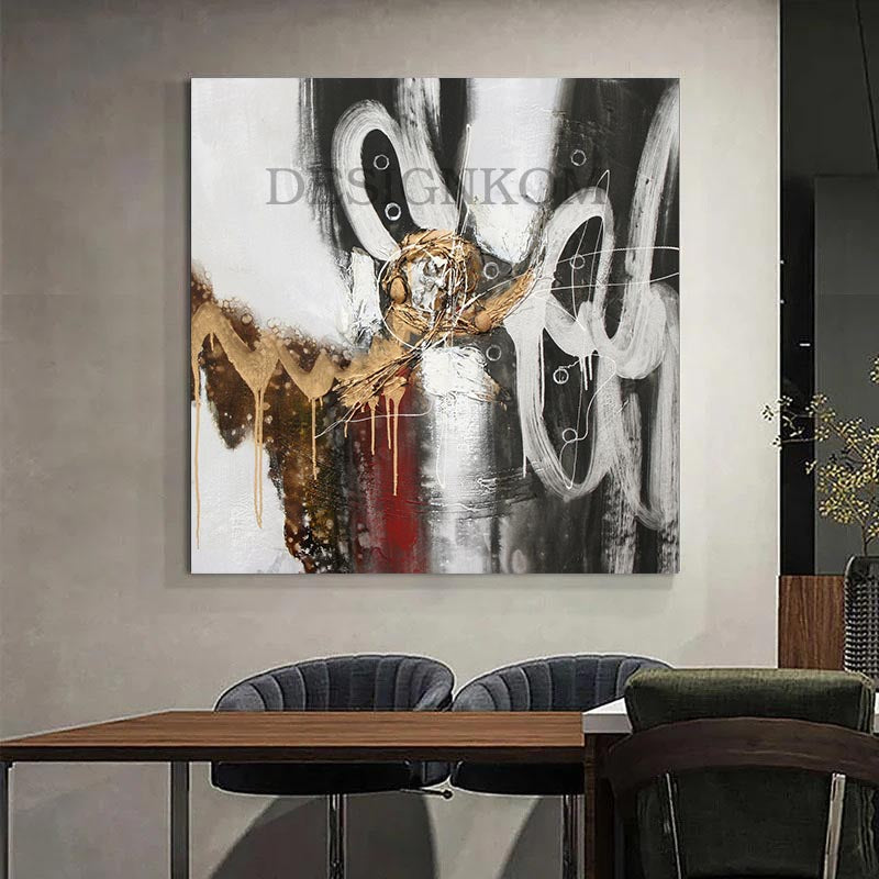 Ce tableau moderne fusionne des tons de noir, blanc, doré et rouge pour créer une composition dynamique et audacieuse. Des lignes fluides et des éclaboussures de peinture ajoutent une touche abstraite et énergique. L’aspect contemporain est enrichi par l’utilisation de l’or, qui apporte une sensation de luxe et de profondeur. L’art abstrait de ce tableau invite à l’interprétation personnelle, tout en offrant une touche élégante et sophistiquée pour n’importe quel intérieur.