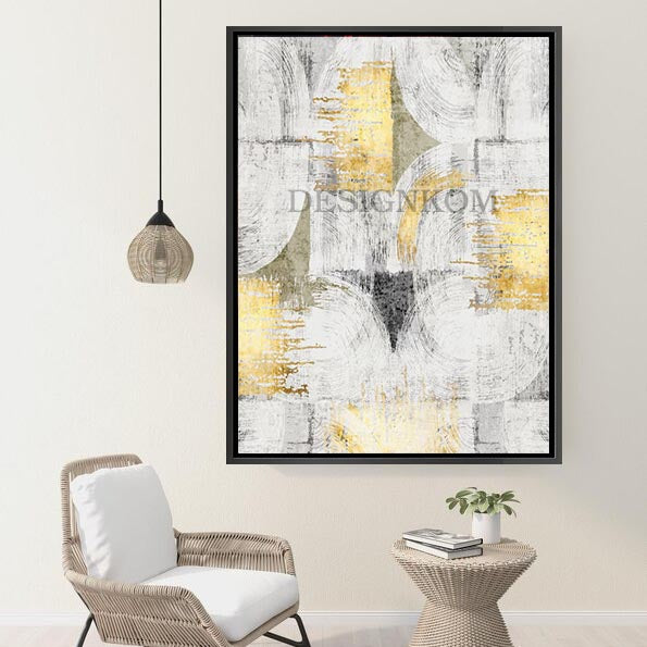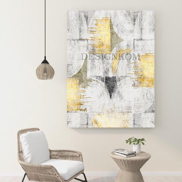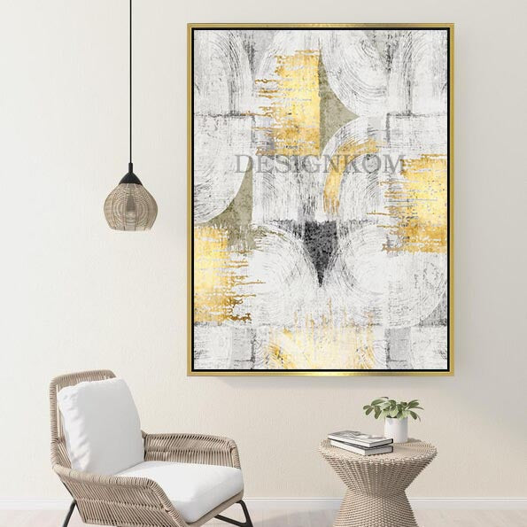 Ce tableau abstrait moderne joue sur une harmonie subtile de formes géométriques et de textures. Les nuances de **gris clair, doré et noir** s'entrelacent avec élégance, créant un contraste raffiné entre lumière et profondeur. Les touches dorées apportent une **note de chaleur et de sophistication**, tandis que les motifs circulaires et rectilignes se combinent pour offrir une composition équilibrée et dynamique.