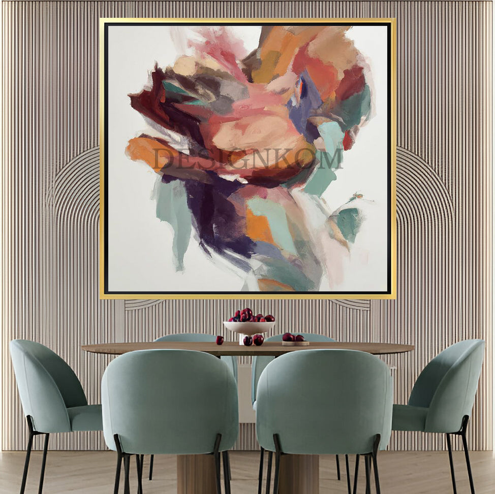 Les coups de pinceau fluides créent une composition expressive et vibrante, parfaite pour habiller un salon, une salle à manger ou un espace professionnel.