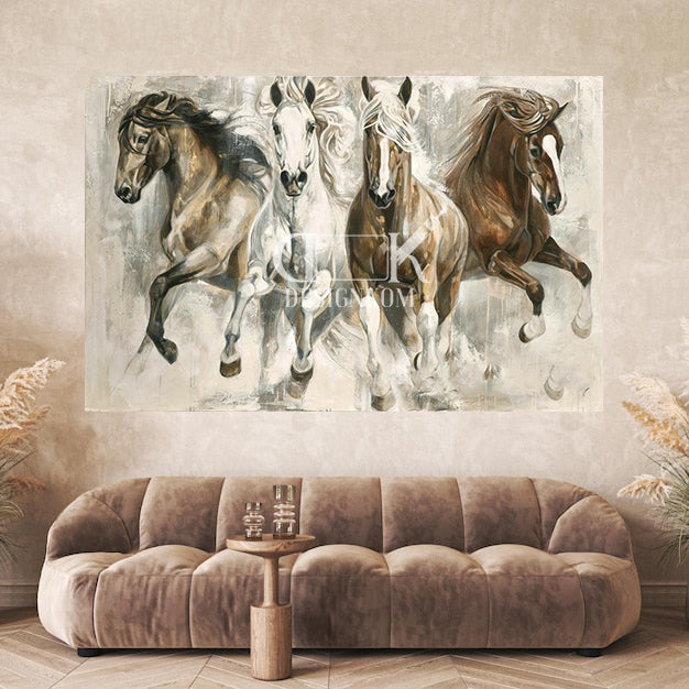 Ce tableau artistique met en scène **quatre chevaux majestueux en pleine course**, symbole de liberté, de puissance et d’élégance. Les nuances douces de beige, blanc et brun s’harmonisent parfaitement pour créer une œuvre à la fois dynamique et raffinée.