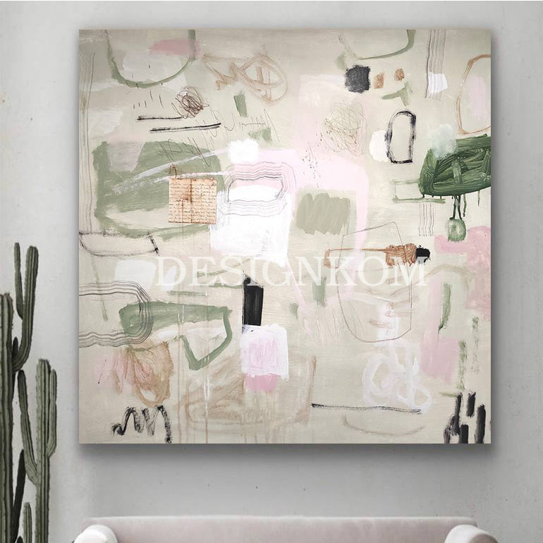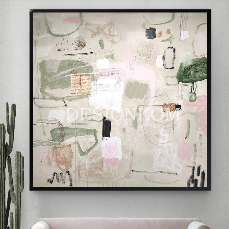Composé de formes fluides et de nuances délicates de rose, vert, beige et noir, ce tableau crée une atmosphère apaisante et élégante.