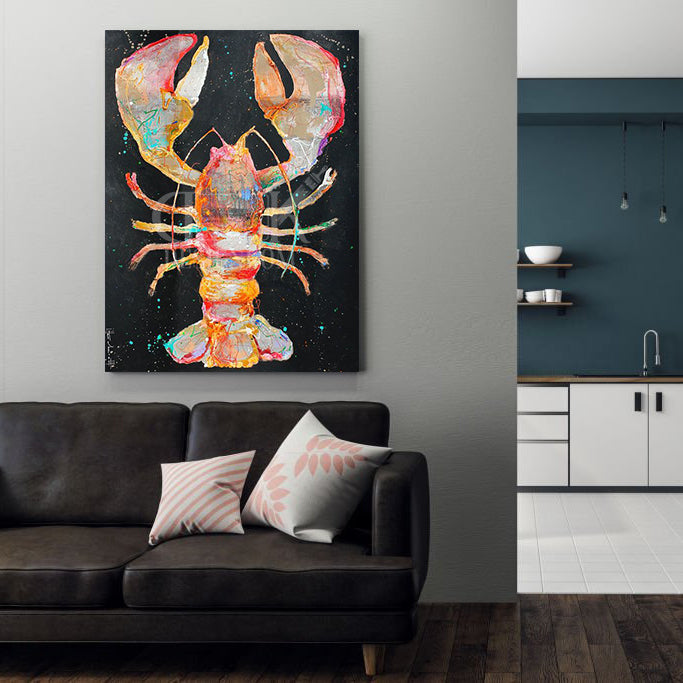 Ce tableau représente un **homard stylisé** peint dans un style **contemporain et abstrait**, mêlant des couleurs vives et contrastées. Les tons dominants de rouge, orange, rose et turquoise se détachent intensément sur un **fond noir profond**, créant un fort impact visuel. Les textures épaisses et les éclaboussures de peinture donnent une sensation de mouvement et d’énergie, presque explosive.