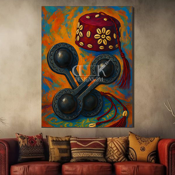 Ce tableau met à l’honneur un **instrument traditionnel Gnawa**, symbole fort de la musique spirituelle marocaine. L’œuvre se distingue par des couleurs chaudes et vibrantes, dominées par des tons orangés et bleutés, évoquant l’énergie, la transe et la profondeur culturelle du patrimoine Gnawa.