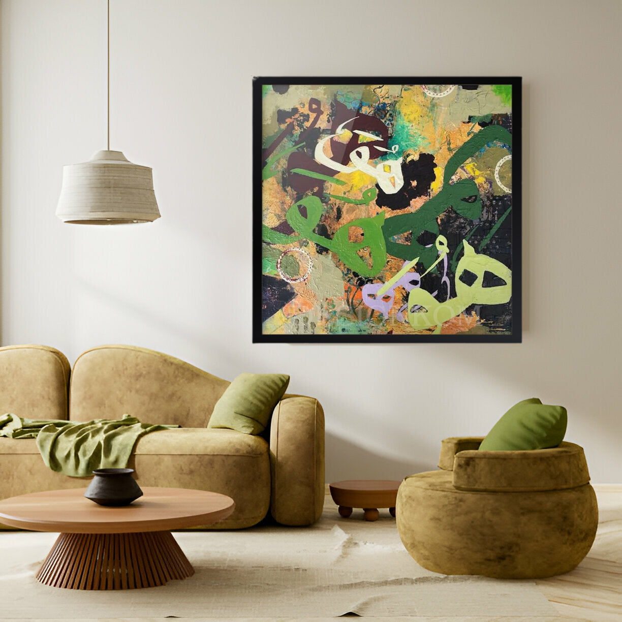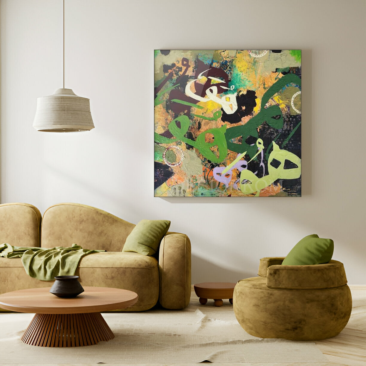 Apportez une dimension spirituelle et artistique à votre intérieur avec ce tableau islamique abstrait inspiré du mot sacré « هو ». Les touches de vert, d’or et de noir se fondent dans une composition moderne mêlant calligraphie et textures contemporaines. Cette œuvre évoque la présence divine d’Allah de manière subtile et méditative, idéale pour un salon, un espace de prière ou une décoration zen et raffinée.