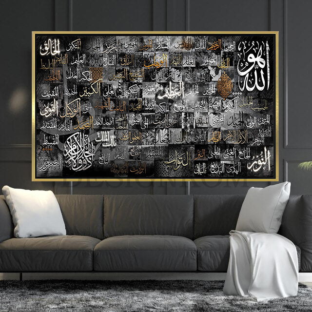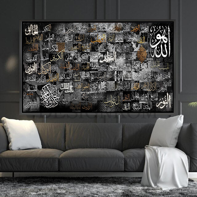 Apportez une **touche spirituelle et élégante** à votre intérieur avec ce magnifique **tableau islamique représentant les 99 Noms d’Allah (Asmae Allah Al Hosna)**.