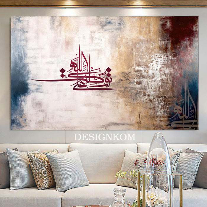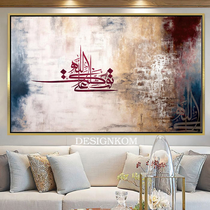 L’inscription, soigneusement stylisée, évoque la **foi, la paix et la confiance en Allah**, tandis que les **teintes dorées, bleutées et bordeaux** se fondent harmonieusement dans une ambiance contemporaine.