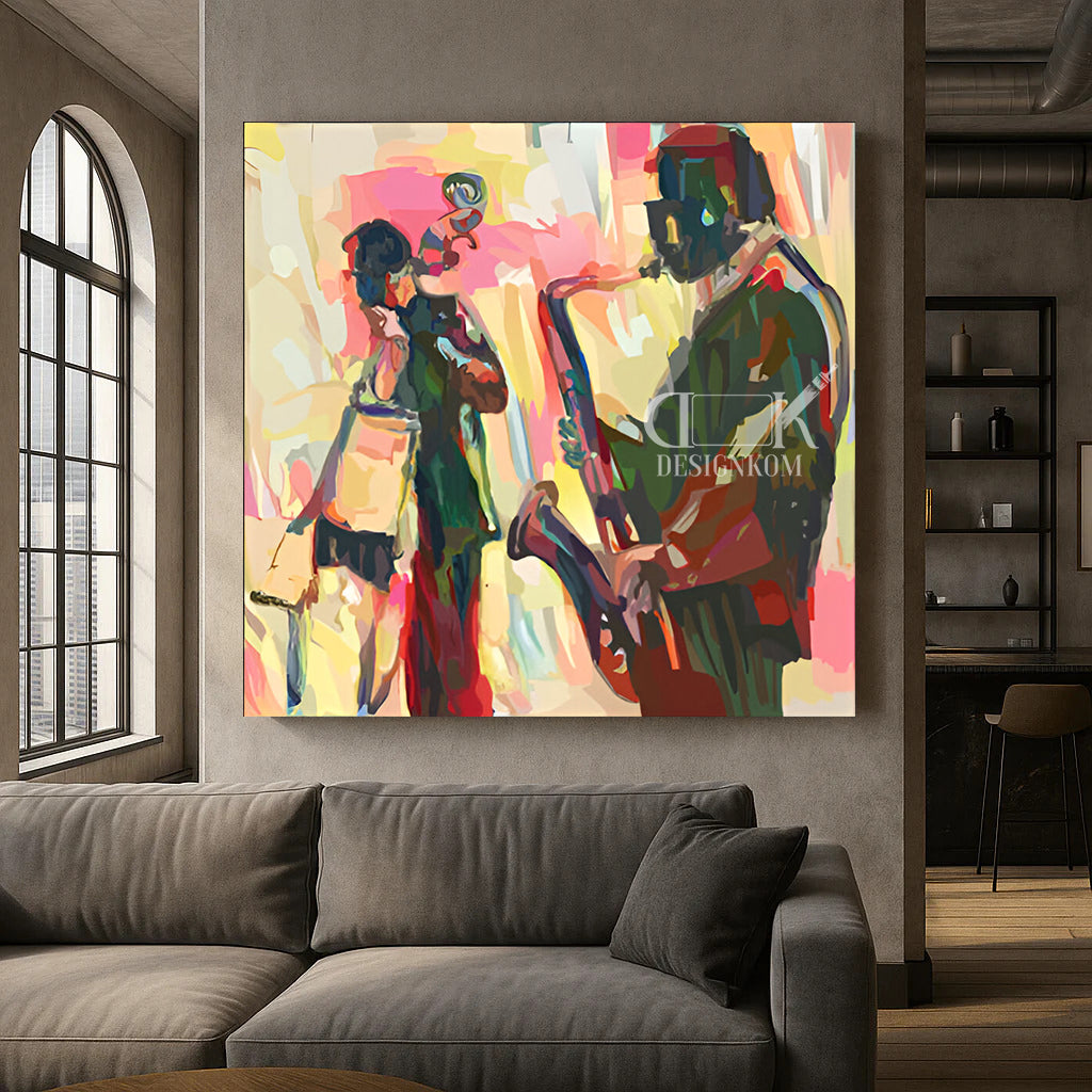 Ce tableau artistique met en scène deux musiciens de jazz, baignés dans une explosion de couleurs chaudes et vibrantes. Les formes semi-abstraites et les coups de pinceau dynamiques traduisent le rythme, l’improvisation et l’âme du jazz. Les tons rosés, jaunes et verts créent une atmosphère chaleureuse et vivante, idéale pour apporter du caractère et une touche artistique contemporaine à un salon, un bureau ou un espace culturel. Une œuvre qui célèbre la musique, l’émotion et le mouvement.