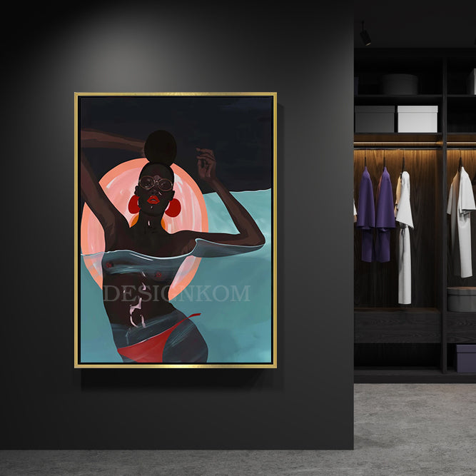 Ajoutez une touche de caractère et de modernité à votre intérieur avec ce tableau Pop Art représentant une femme élégante et confiante face à un soleil déclinant. Les contrastes puissants entre les tons sombres de la peau, les reflets turquoise et le halo rosé créent une composition audacieuse et contemporaine. Les détails comme les lunettes rondes, les boucles d’oreilles rouges et la posture affirmée évoquent à la fois liberté, beauté et force féminine.
