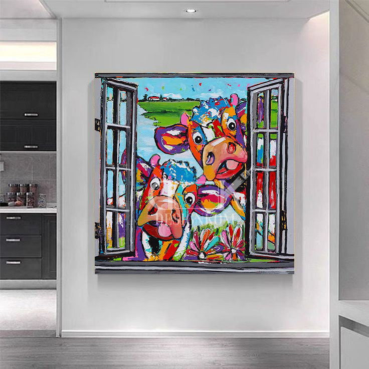 Ce tableau moderne et humoristique met en scène trois vaches colorées qui apparaissent à travers une fenêtre ouverte, comme si elles observaient la pièce. Les couleurs vives — bleu, rose, orange, jaune, vert — donnent un style pop art plein d’énergie.