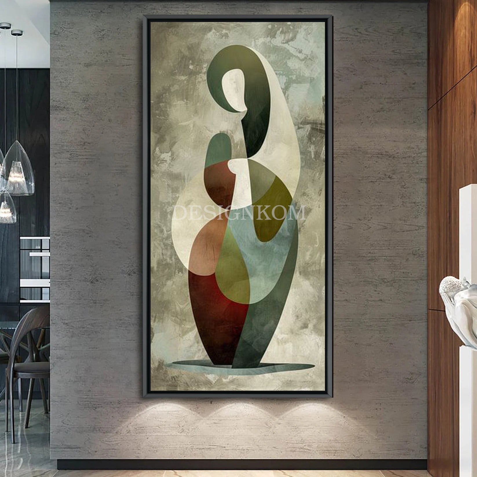 Ce tableau artistique moderne représente une silhouette abstraite stylisée, formée par des formes géométriques superposées dans des tons profonds : vert olive, bordeaux, beige et bleu gris. L’œuvre dégage une harmonie douce et élégante, avec une touche minimaliste et contemporaine. La figure évoque la douceur, la connexion et la fluidité, idéale pour apporter une ambiance chaleureuse et raffinée dans un hall d’entrée, un salon ou un espace de vie moderne.