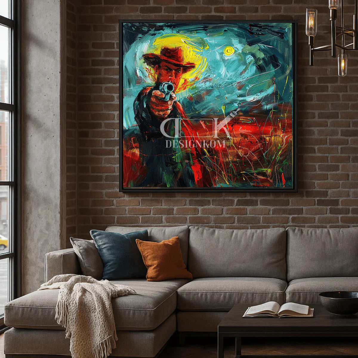 Un tableau Western moderne et expressif, mêlant couleurs intenses, ambiance cinématographique et style artistique unique. Parfait pour une décoration forte en caractère.