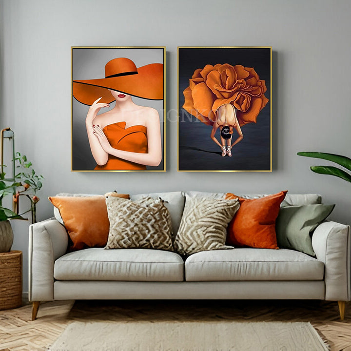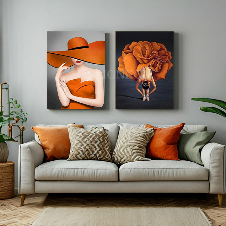 Apportez une touche de **raffinement et de modernité** à votre intérieur avec ce magnifique **duo de tableaux muraux** représentant deux œuvres artistiques féminines dans des tons **orange vif et chaleureux**.
