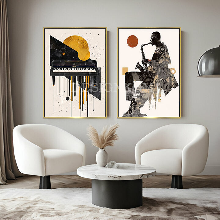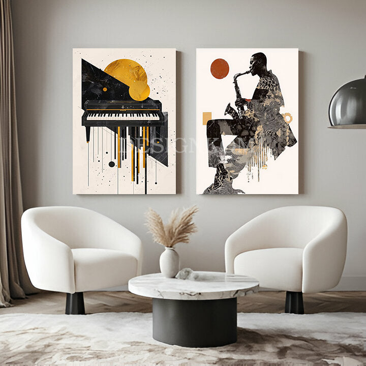 Plongez dans l’ambiance feutrée du jazz avec ce duo de tableaux modernes « Jazz Élite ». Le premier met en avant un piano stylisé aux teintes noires et dorées, tandis que le second illustre un saxophoniste en pleine improvisation.